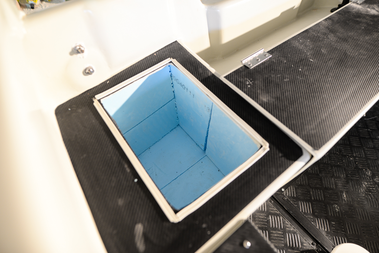 I stuvfacken på aktertoften passades bitar av cellplast in för att bidra med extra säkerhet som flytmaterial. Här kommer sedan en insats av plast att tryckas in och ovanpå en vattentät lucka.